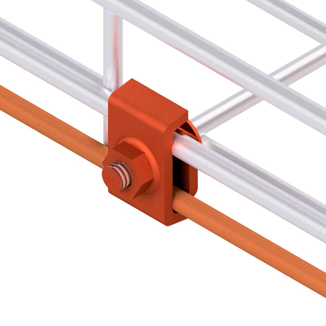 Diseñada para sujetar la línea de puesta a tierra a la bandeja tipo malla Galcofil por medio de dos platinas de acero cobrizado unidas entre sí con tornillo carriaje de 1/4” x 3/4”