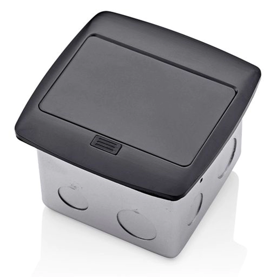 Caja desplegable para piso con combinación de receptáculo dúplex/tomacorriente y cargador USB.  15 A, 125 V, receptáculo/tomacorriente a prueba de manipulaciones Decora, NEMA 5-15 R, 3,6 A, 5 V CC, cargador USB 2.0 tipo A precableado al bloque de terminales – Negro